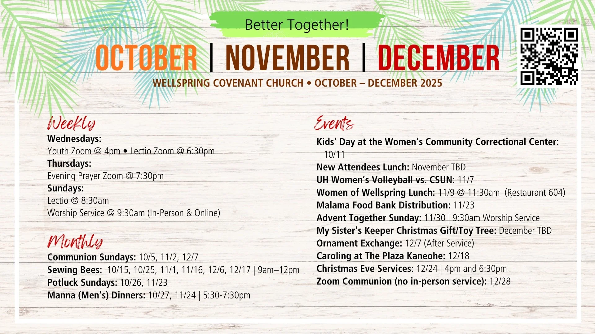 A time of fellowship with the Men of Wellspring. Please RSVP to John Enomoto: 808-295-1217 or john.enomoto@pcfgrp.com