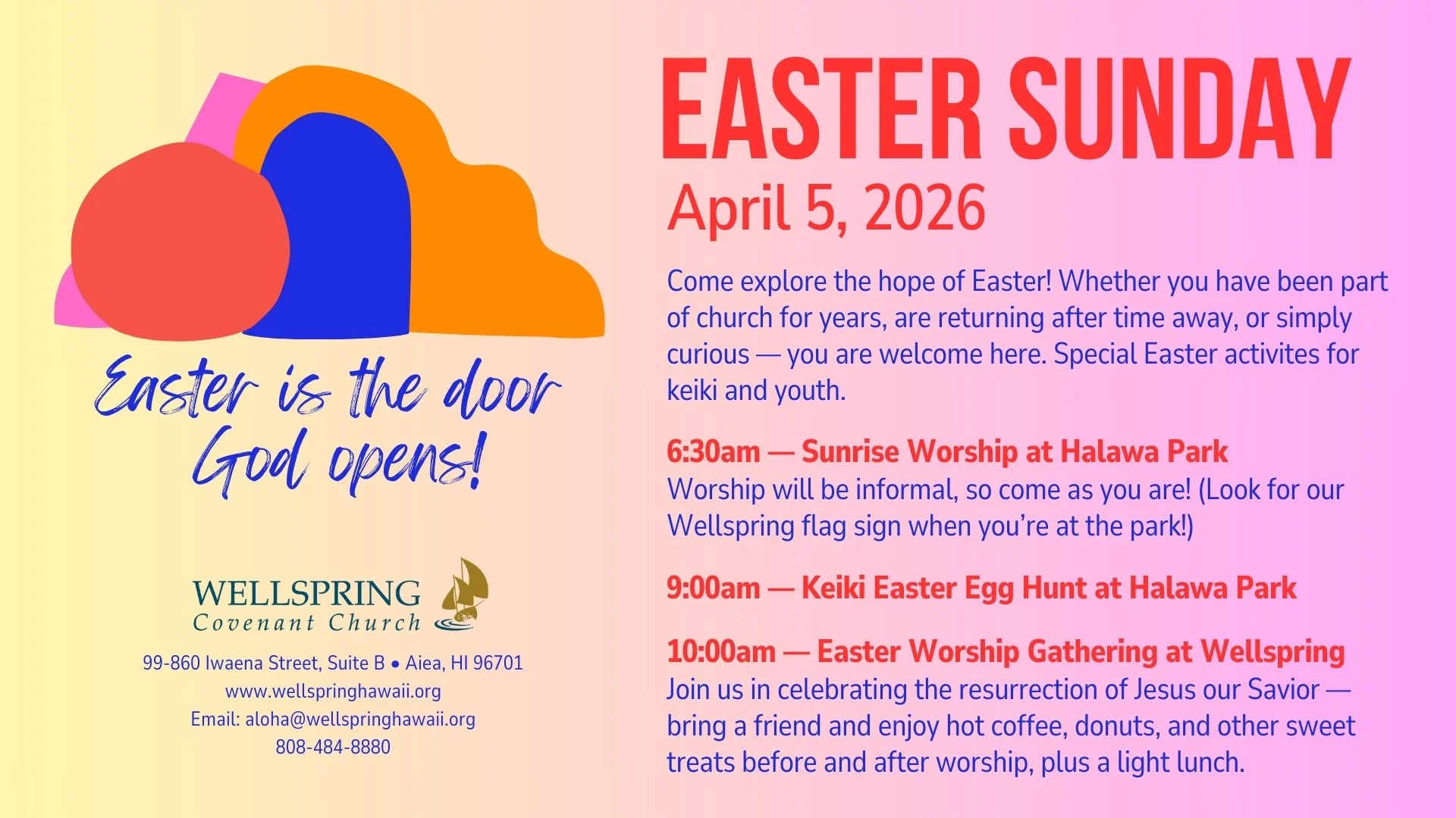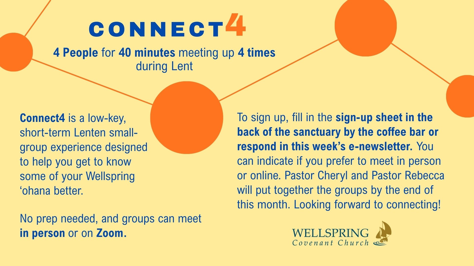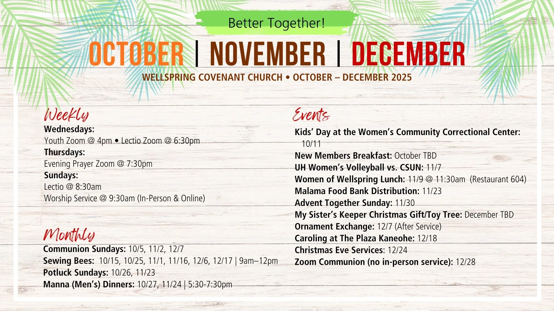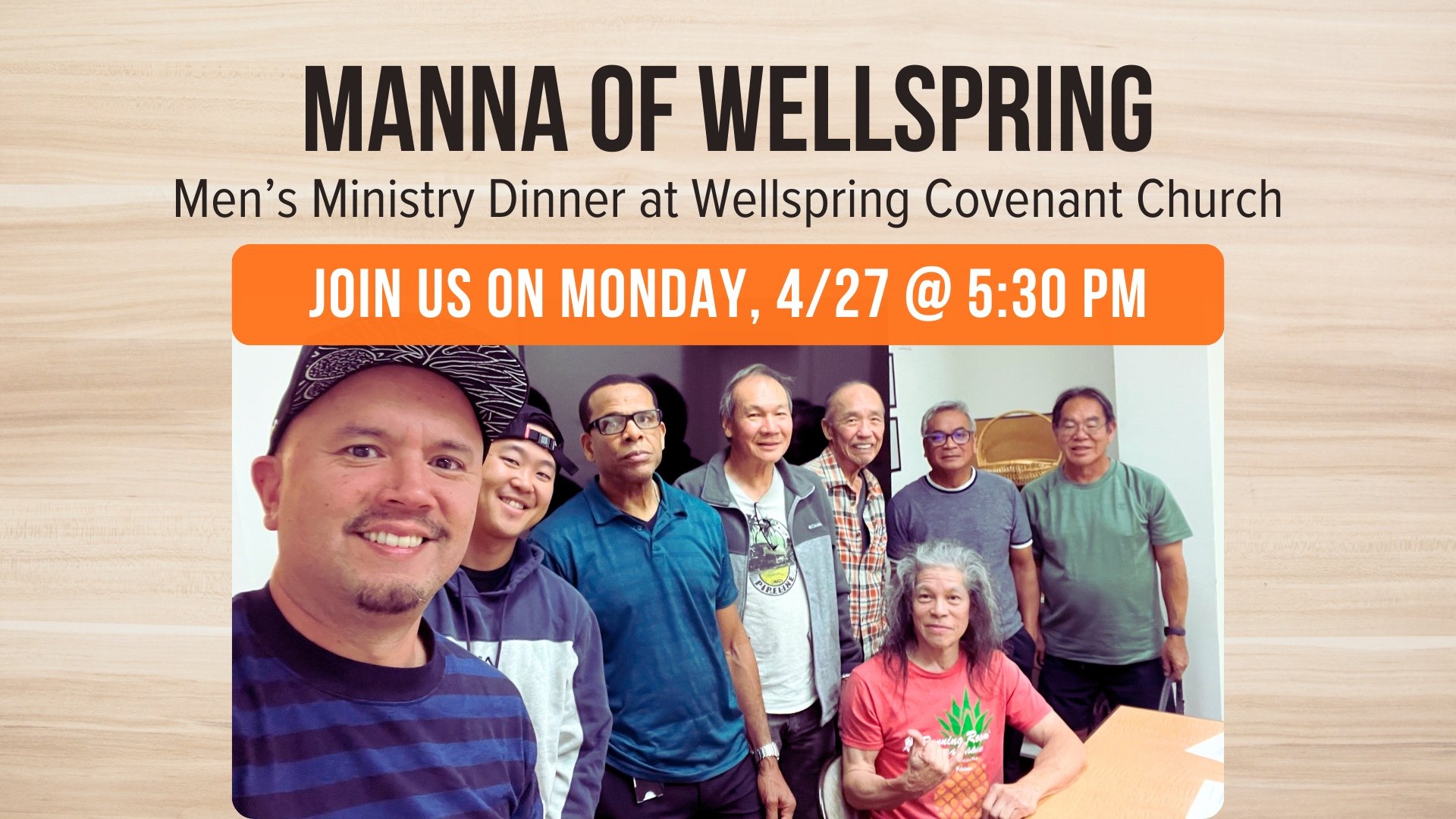 A time of fellowship with the Men of Wellspring. Please RSVP to John Enomoto: 808-295-1217 or john.enomoto@pcfgrp.com